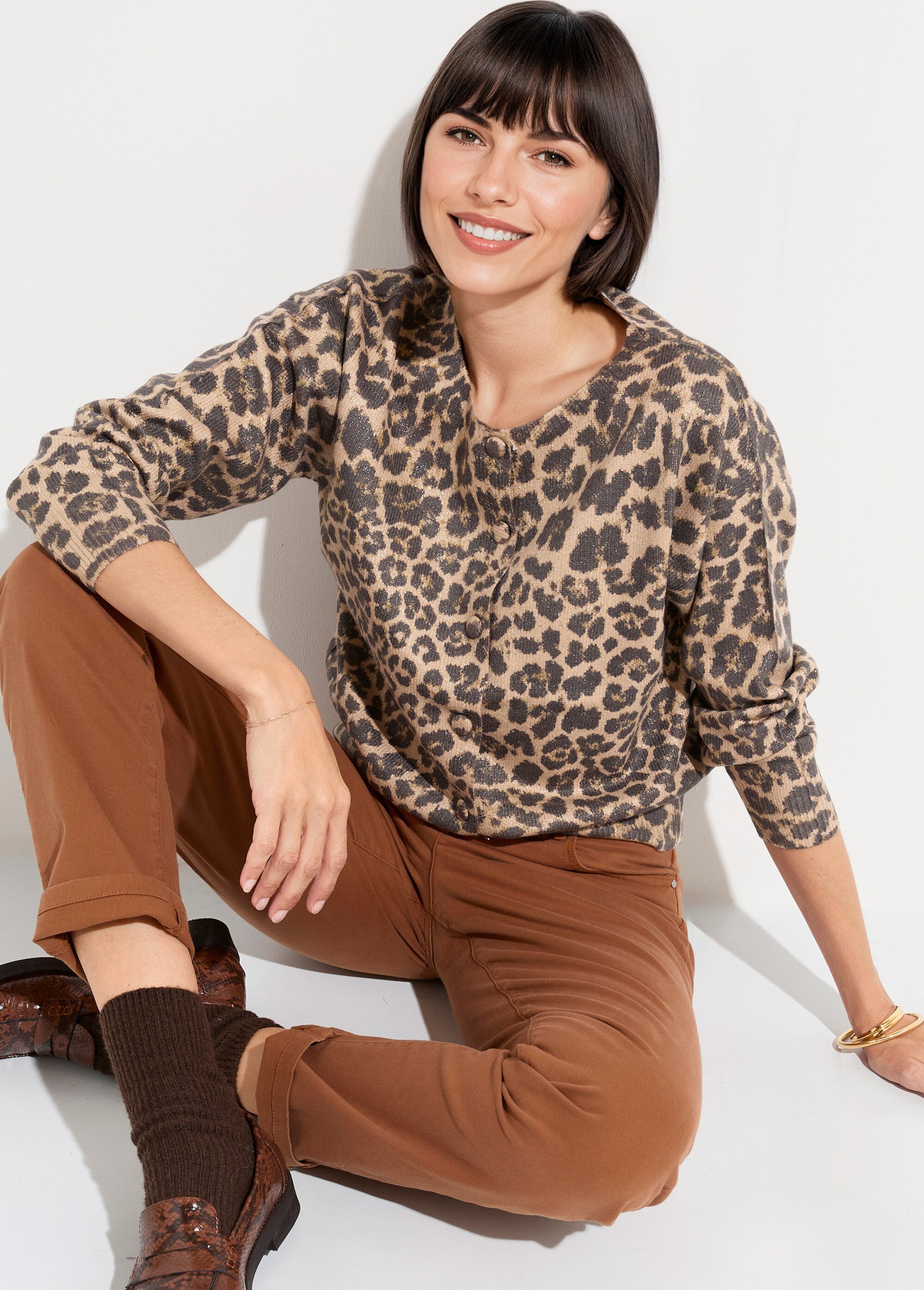 Ce gilet à la maille léopard, orné de jolis petits boutons recouverts, incarne à merveille l'alliance du style et de la féminité. Avec ses accents métallisés grâce aux fibres Lurex®, il apporte une touche d'éclat à n'importe quelle tenue. Que ce soit pour une sortie entre amis ou une journée au bureau, ce gilet s'adapte à toutes les occasions. Sa texture douce et agréable à porter vous enveloppe de confort tout en affirmant votre personnalité. Un incontournable à ajouter à votre garde-robe pour un look chic et audacieux.